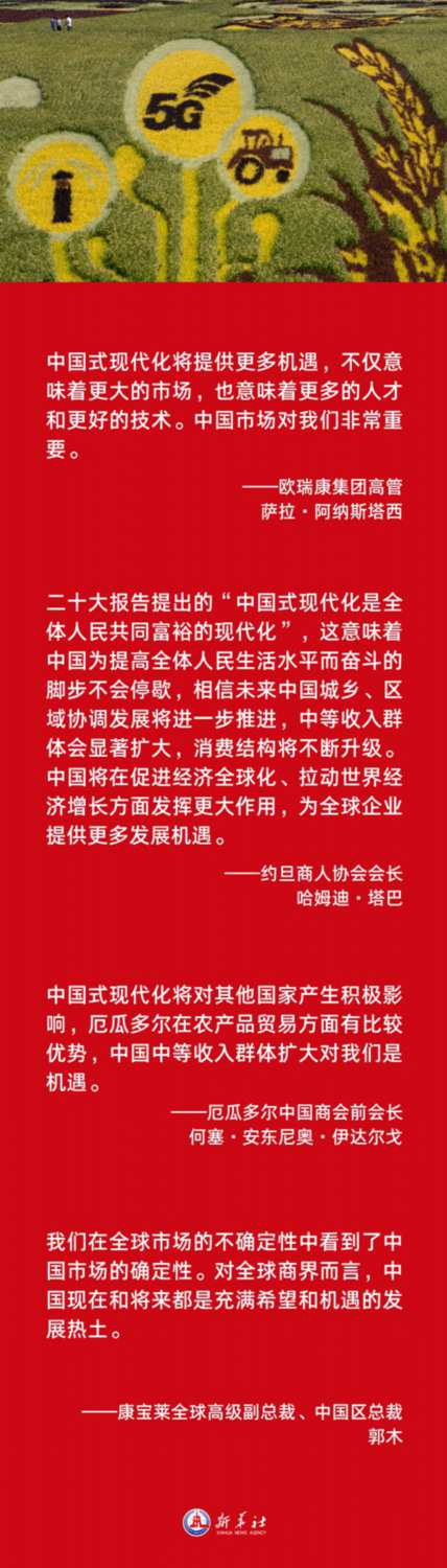 全球工商界人士在接受新華社記者采訪時(shí)普遍認(rèn)為,中共二十大不僅為新時(shí)代中國(guó)發(fā)展擘畫藍(lán)圖,也堅(jiān)定了各國(guó)企業(yè)深耕中國(guó)市場(chǎng)的信心與決心。全球工商界人士期待進(jìn)一步加強(qiáng)同中國(guó)的合作。