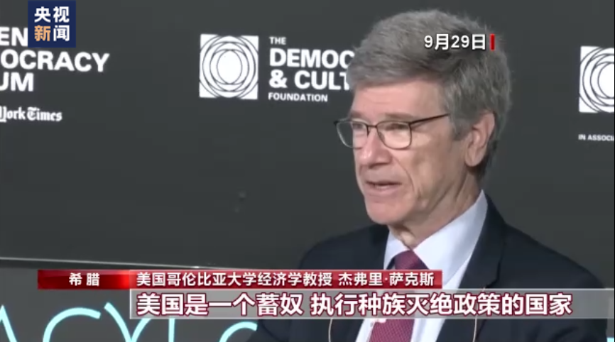 9月29日,杰弗里·薩克斯在希臘的一個(gè)論壇上作為嘉賓發(fā)言。在發(fā)言中,他痛斥以美國為代表的所謂“西方民主”赤裸裸的雙標(biāo)性,卻遭到論壇主持人多次打斷。
