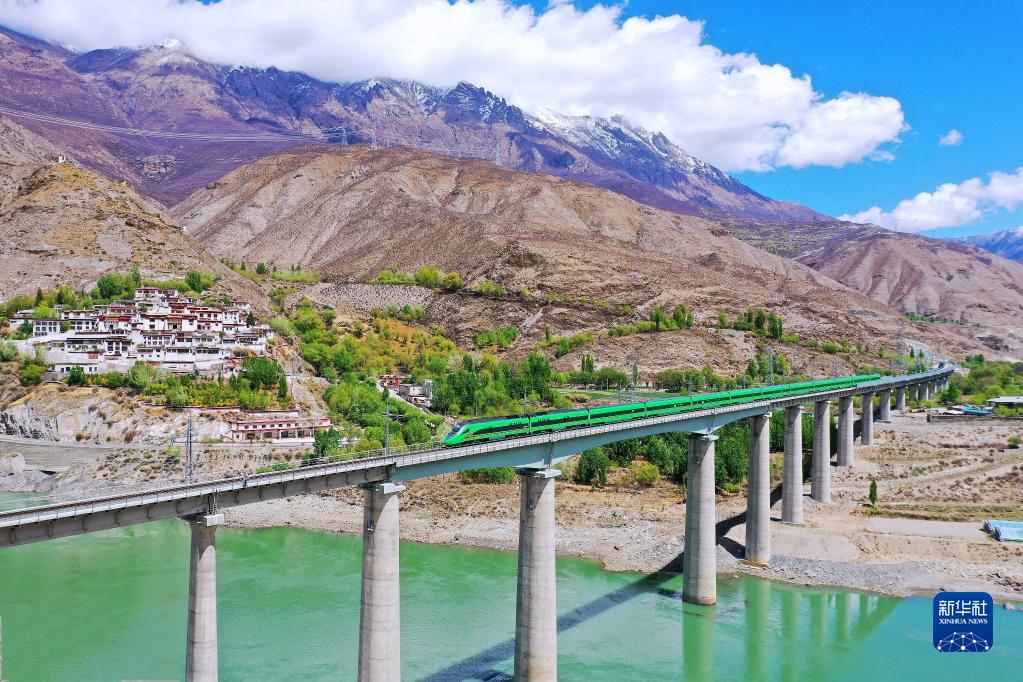 復(fù)興號(hào)列車行駛在西藏朗縣境內(nèi)(2022年4月14日攝)。新華社記者 覺果 攝