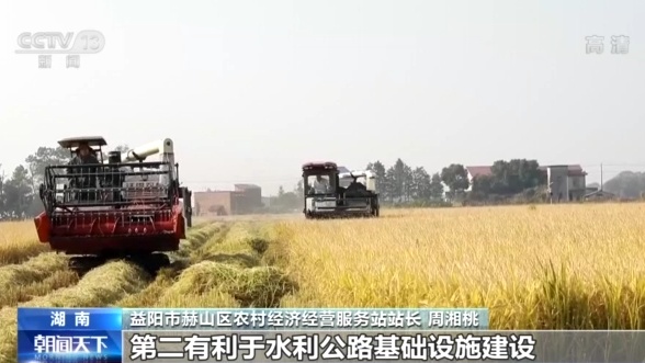 總臺記者 鄢俊琪:我現(xiàn)在所在的位置是江西省上饒市萬年縣的湖云鄉(xiāng),這里地處鄱陽湖平原的腹地,鄱陽湖平原是江西產(chǎn)糧的一個大區(qū)域,這里也是一個重要的產(chǎn)地。大家可以看到在我身后的高標準農(nóng)田里,一臺臺收割機正在開足馬力抓緊收割,確保我們的秋糧顆粒歸倉。