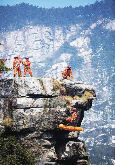 江西廬山風(fēng)景區(qū)消防救援大隊(duì)在廬山錦繡谷進(jìn)行救援演練。傅建斌攝/光明圖片