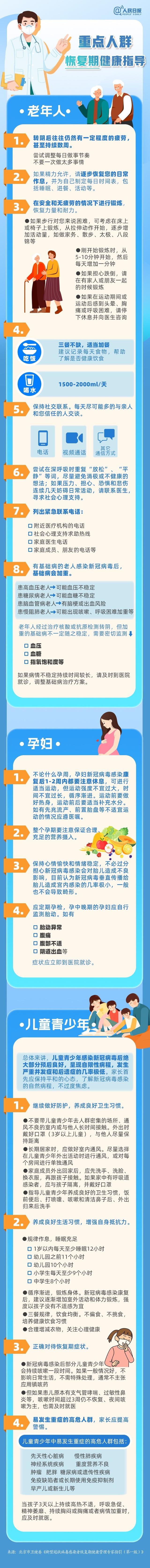 新冠病毒感染恢復期,雖然核酸、抗原檢測結(jié)果已經(jīng)轉(zhuǎn)陰,但機體尚未恢復到病前水平,需要1到2周甚至更長時間才能完全緩解。老年人恢復期間需要注意哪些指標?孕婦出現(xiàn)哪些癥狀應及時就診?哪些兒童青少年是重癥高危人群?一圖了解重點人群恢復期健康指導。
