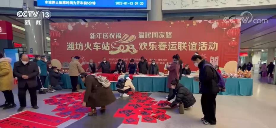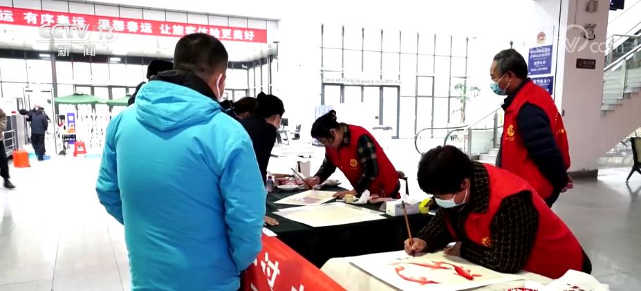 在山東濰坊火車站的候車大廳,濰坊風(fēng)箏、楊家埠木版年畫(huà)、高密泥塑等琳瑯滿目,吸引了不少旅客的目光。非遺傳承人和書(shū)法家也走進(jìn)候車大廳,為返鄉(xiāng)的旅客送去真摯的新年祝福。在青州火車站,書(shū)法家們還現(xiàn)場(chǎng)揮毫潑墨,一張張包含祝福的“!弊,讓旅客們感受到濃濃的年味。