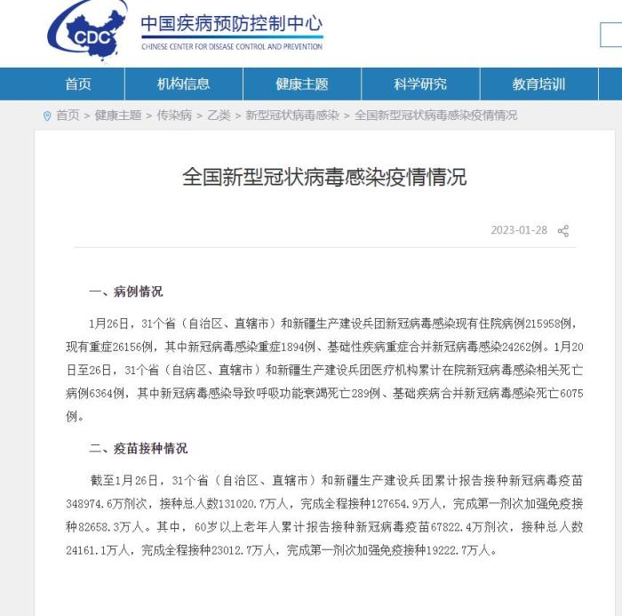 中疾控發(fā)布全國新型冠狀病毒感染疫情情況