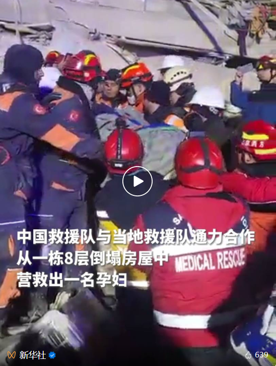中國救援隊(duì)副隊(duì)長趙洋告訴新華社記者,8日下午6時許,土方營救人員聯(lián)系中國救援隊(duì),說在哈塔伊省安塔基亞市一棟8層倒塌房屋的廢墟中發(fā)現(xiàn)一名孕婦,中國救援隊(duì)隨即到現(xiàn)場進(jìn)行評估,與土方共同制定營救方案,全程提供專家指導(dǎo)與技術(shù)裝備支持,雙方通力合作,經(jīng)過數(shù)小時艱苦努力,成功營救出被困孕婦。