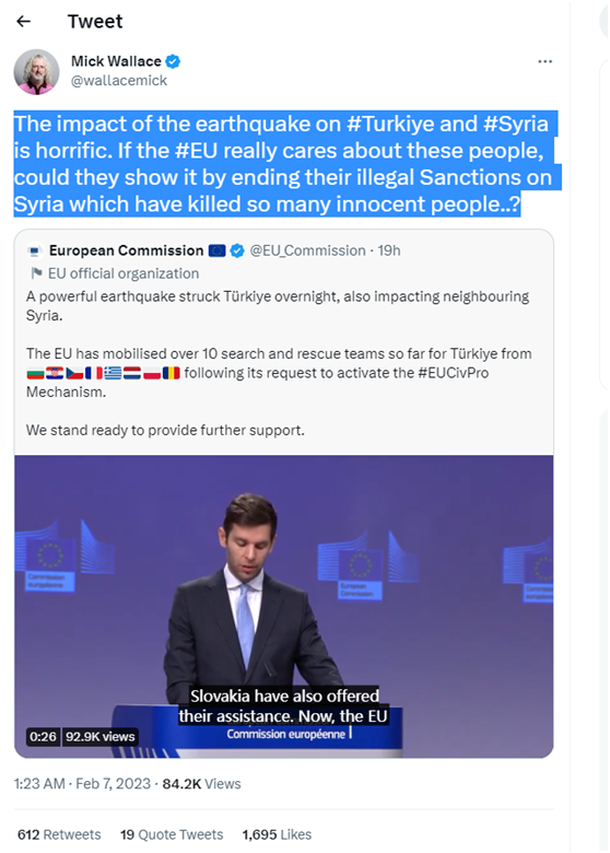 歐洲議會議員米克·華萊士在社交媒體推特發(fā)文說:“地震對土耳其和敘利亞的影響是可怕的。如果歐盟真的關(guān)心這些人,他們能通過結(jié)束對敘利亞的非法制裁來表明這一點(diǎn)嗎?”