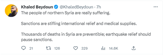 美國韋恩州立大學(xué)法學(xué)教授哈立德·貝杜恩在推特上說:“敘利亞北部的人民真的很痛苦。制裁扼殺了國際救援和醫(yī)療物資。敘利亞數(shù)千人的死亡是可以預(yù)防的;抗震救災(zāi)應(yīng)暫停制裁!