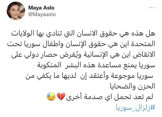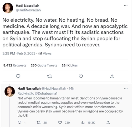 網(wǎng)友哈迪·納斯魯拉評論道:“西方必須解除對敘利亞的瘋狂制裁,并停止出于政治目的對敘利亞人民的壓制……對敘利亞的制裁導(dǎo)致醫(yī)療設(shè)備、物資甚至勞動力短缺。敘利亞無法承受更多人面臨無家可歸的困境。敘利亞人幾乎無法取暖,因?yàn)樗麄兊氖彤a(chǎn)區(qū)被美國占領(lǐng)……”