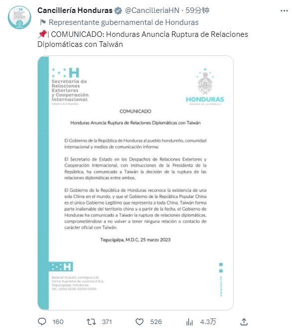 當(dāng)?shù)貢r間3月25日,洪都拉斯外交部發(fā)表聲明,正式宣布與中國臺灣斷絕“外交關(guān)系”。
