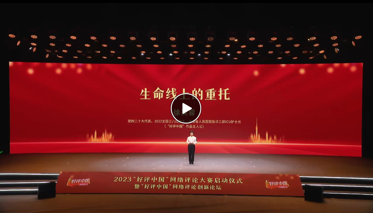 3月31日,2023“好評(píng)中國(guó)”網(wǎng)絡(luò)評(píng)論大賽啟動(dòng)儀式暨“好評(píng)中國(guó)”網(wǎng)絡(luò)評(píng)論創(chuàng)新論壇在湖南長(zhǎng)沙舉行;顒(dòng)現(xiàn)場(chǎng),黨的二十大代表,湖南省人民醫(yī)院急診三部ICU護(hù)士長(zhǎng),“好評(píng)中國(guó)”參賽作品主人公徐芙蓉圍繞《生命線上的重托》作主題分享。