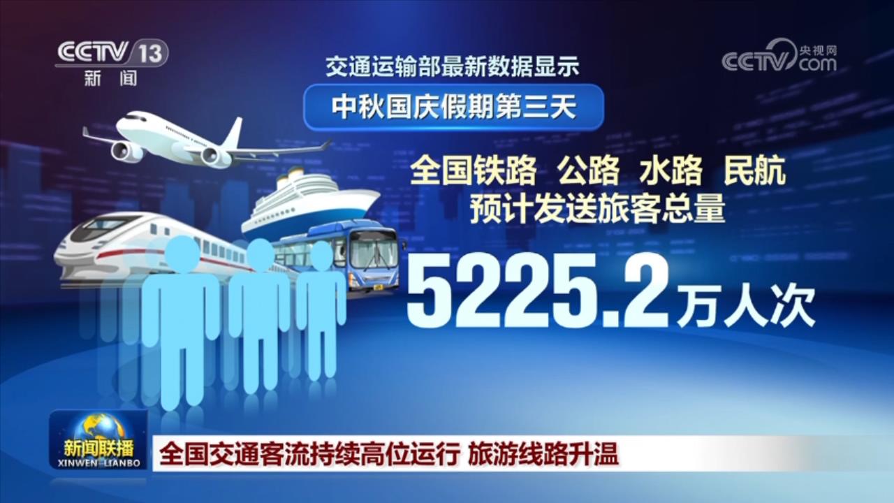 央視網(wǎng)消息(新聞聯(lián)播):交通運輸部最新數(shù)據(jù)顯示,中秋國慶假期第三天,全國鐵路、公路、水路、民航預(yù)計發(fā)送旅客總量5225.2萬人次。出行熱度不減,長三角鐵路部門10月1日在多個熱門旅游城市間加強運力增補。多地鐵路局還結(jié)合旅游區(qū)域特色,開通旅游專列。