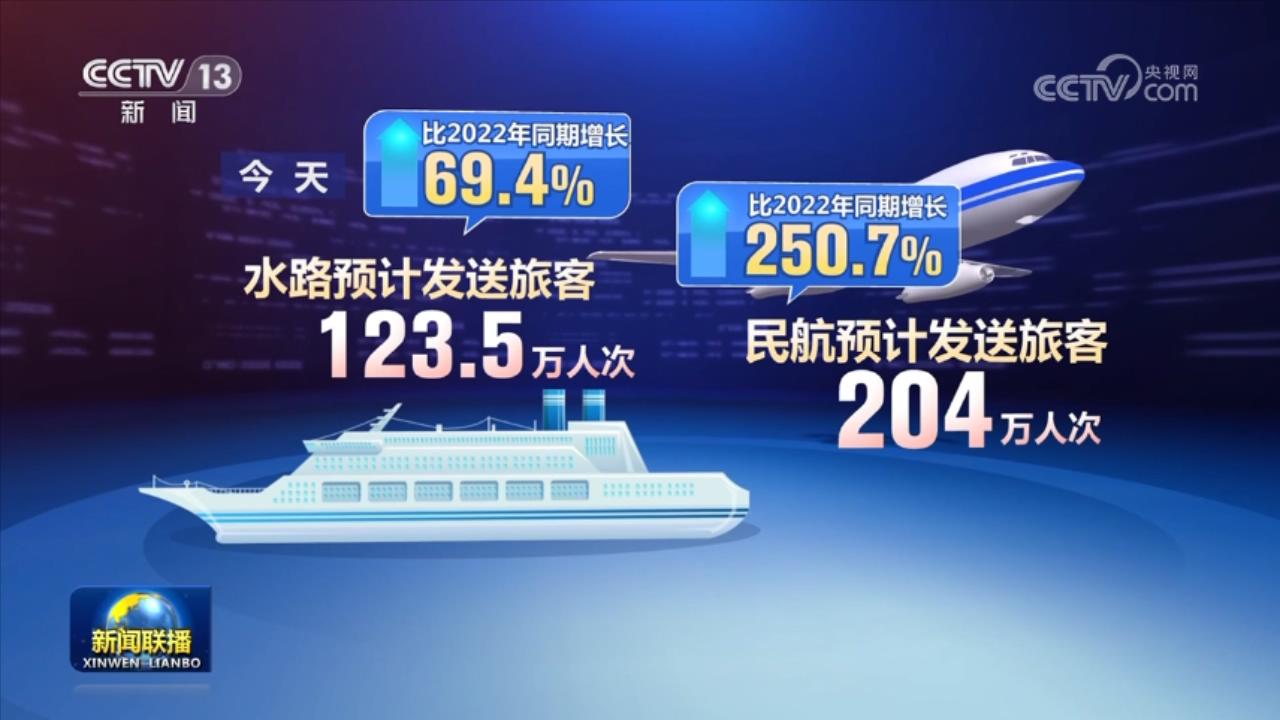 今天,水路預(yù)計發(fā)送旅客123.5萬人次,民航預(yù)計發(fā)送旅客204萬人次,比2022年同期分別增長69.4%和250.7%。