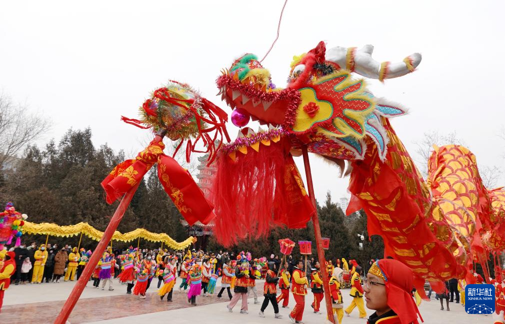 2月22日,在河南省博愛縣北朱營村,村里的文藝隊在表演舞獅。