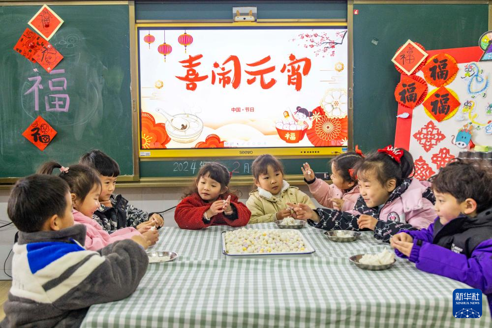 2月22日,江蘇省泰州市九龍鎮(zhèn)中心幼兒園的小朋友在制作湯圓。