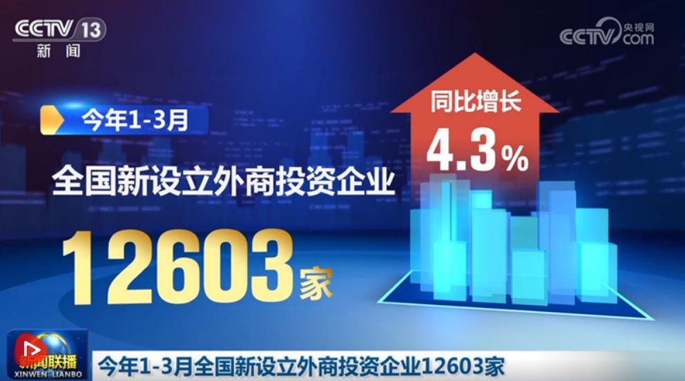央視網(wǎng)消息(新聞聯(lián)播):商務(wù)部最新數(shù)據(jù)顯示,今年1—3月,全國(guó)新設(shè)立外商投資企業(yè)12603家,同比增長(zhǎng)4.3%;實(shí)際使用外資金額2692.3億元人民幣。