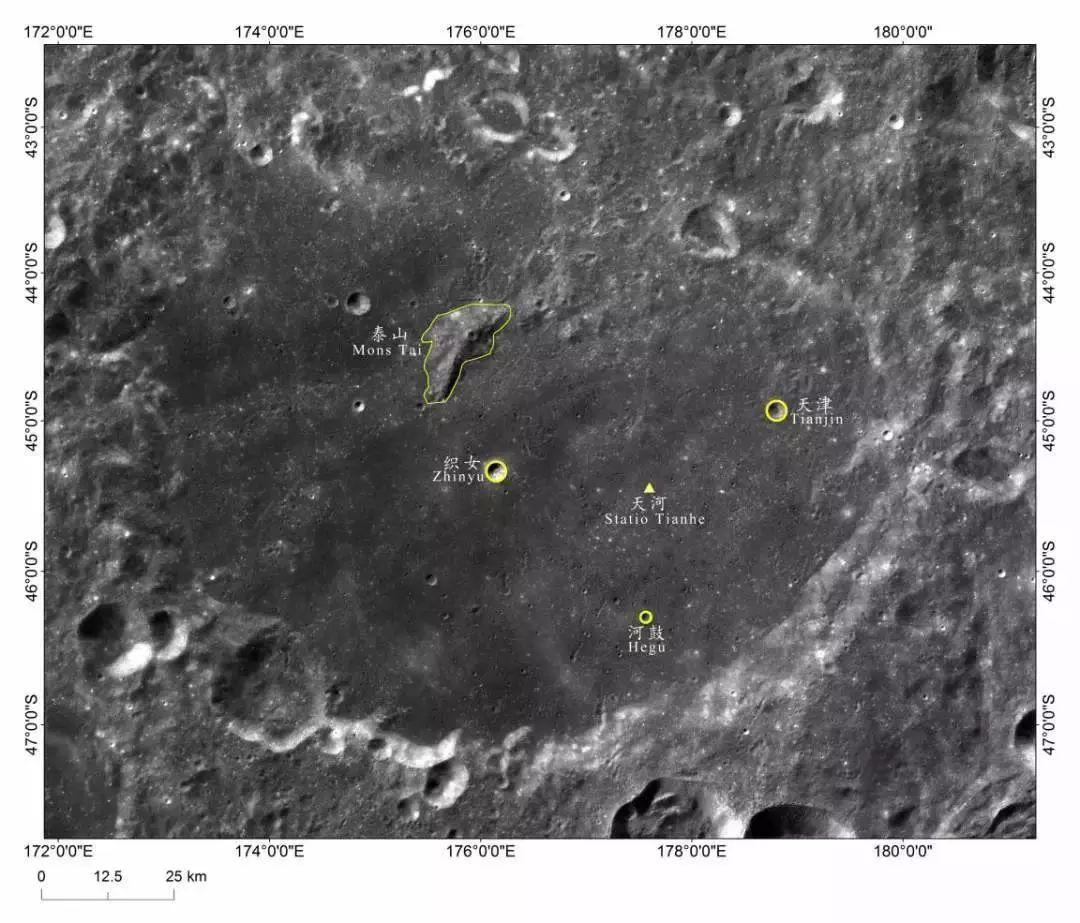 2019年2月4日,國(guó)際天文學(xué)聯(lián)合會(huì)(IAU)批準(zhǔn)了利用探月工程嫦娥二號(hào)和嫦娥四號(hào)高分辨月面影像數(shù)據(jù)申報(bào)的嫦娥四號(hào)著陸點(diǎn)及附近5個(gè)月球地理實(shí)體名稱:天河基地、織女、河鼓、天津、泰山。這是我國(guó)月球探測(cè)工程科學(xué)數(shù)據(jù)成果在月球地理實(shí)體命名上的又一次重要應(yīng)用。至此,國(guó)際天文學(xué)聯(lián)合會(huì)(IAU)公布的月球地名中,有27個(gè)以中國(guó)元素命名的月球地形單元。