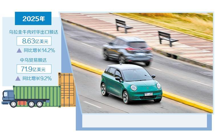 今年適逢中烏建交38周年,中國已連續(xù)10余年保持烏拉圭第一大貿(mào)易伙伴地位。2023年建立全面戰(zhàn)略伙伴關系以來,中烏雙邊貿(mào)易快速發(fā)展、亮點紛呈。烏拉圭的紅酒、牛肉、乳制品等產(chǎn)品為中國消費者提供了更多選擇,中國的汽車、家電、日用品等極大豐富了烏拉圭人民的物質(zhì)生活。數(shù)據(jù)顯示,2025年,中烏貿(mào)易額達71.9億美元,同比增長9.2%。同年,烏拉圭豆粕和菜籽粕等新產(chǎn)品獲得輸華準入,兩國農(nóng)牧業(yè)合作迎來了更大空間。