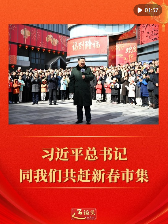 習近平總書記同人民群眾共趕市集、共迎新春,是年節(jié)里最溫暖的圖景。總書記走到百姓中間,送上真摯的新春祝福:“在農歷馬年龍馬精神、身體健康、事業(yè)有成、闔家幸福!”