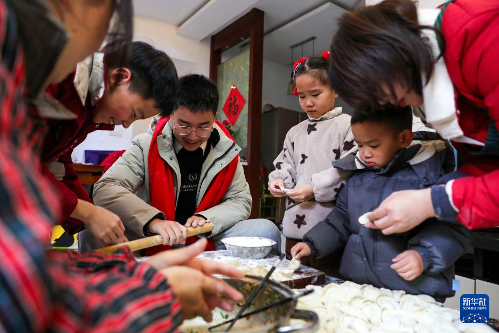 2月16日,在重慶西南大學(xué),工作人員和留校學(xué)生組成“臨時家庭”一起包餃子慶新春。