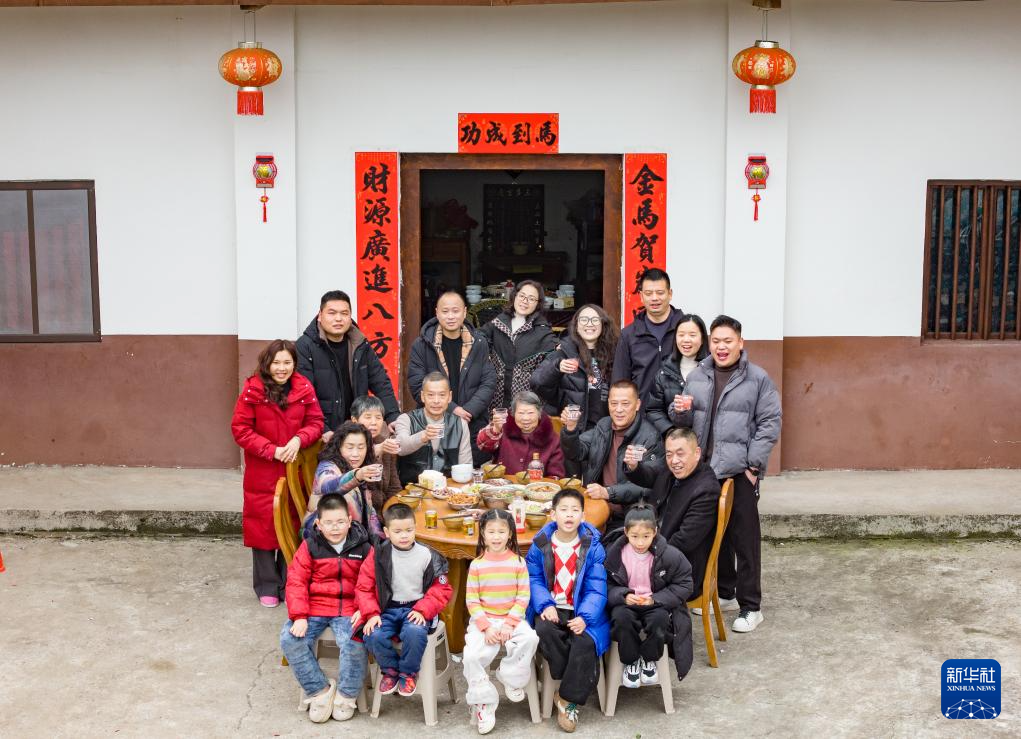 2月16日,在四川省南充市順慶區(qū)清平村,村民陳俊堯一家祖孫四代吃團年飯。