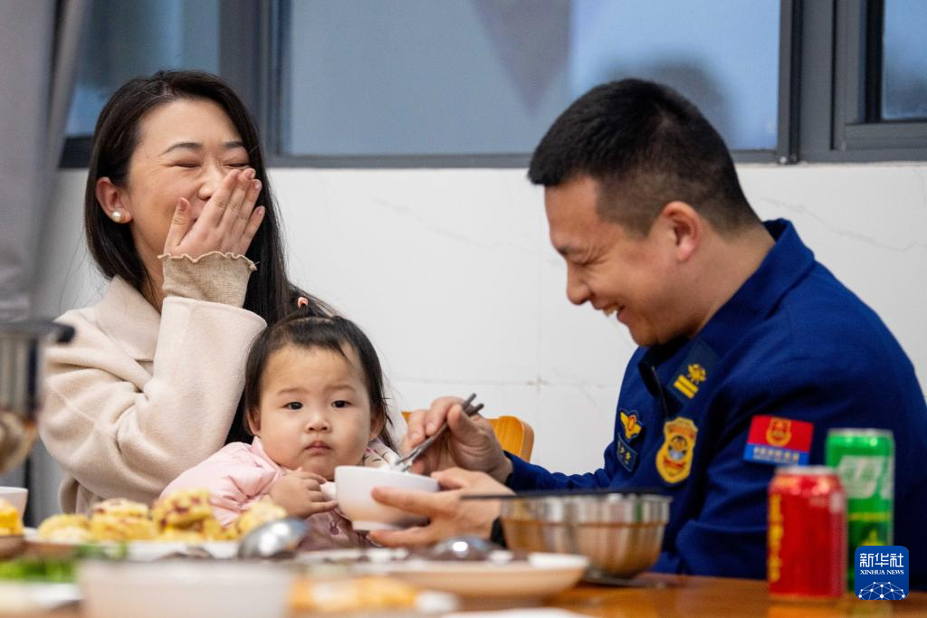 2月16日,在江蘇省泰興市澄江西路消防救援站,消防員和家屬一起吃團圓飯。