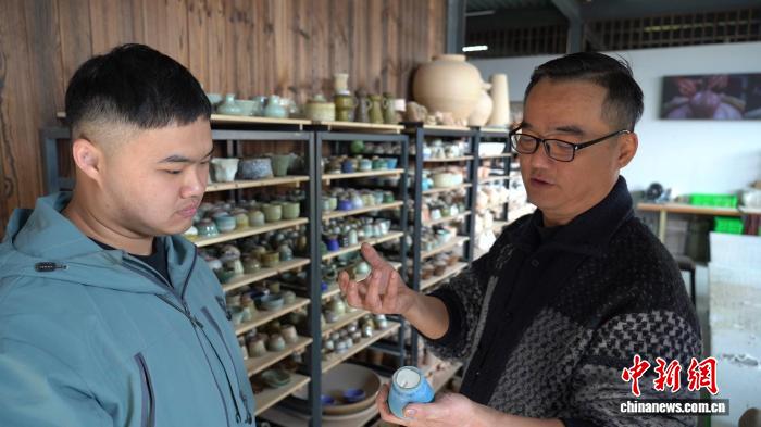 2026年春節(jié),成都彭州海窩子古鎮(zhèn),蔡兆慶與兒子在討論陶瓷工藝。中新社記者 呂楊 攝
