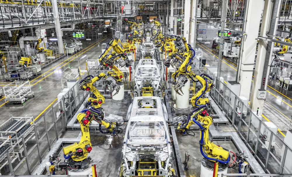 在位于重慶市兩江新區(qū)的賽力斯汽車超級(jí)工廠拍攝的自動(dòng)化生產(chǎn)作業(yè)現(xiàn)場(2025年9月19日攝)。新華社記者 王全超 攝