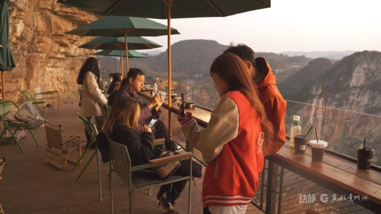 站在懸崖咖啡廳,腳下是150米垂直落差的喀斯特峽谷,建筑與青山融為一體,一杯熱咖啡,滿眼好風光。即便氣溫偏低,這里依舊人氣滿滿。
