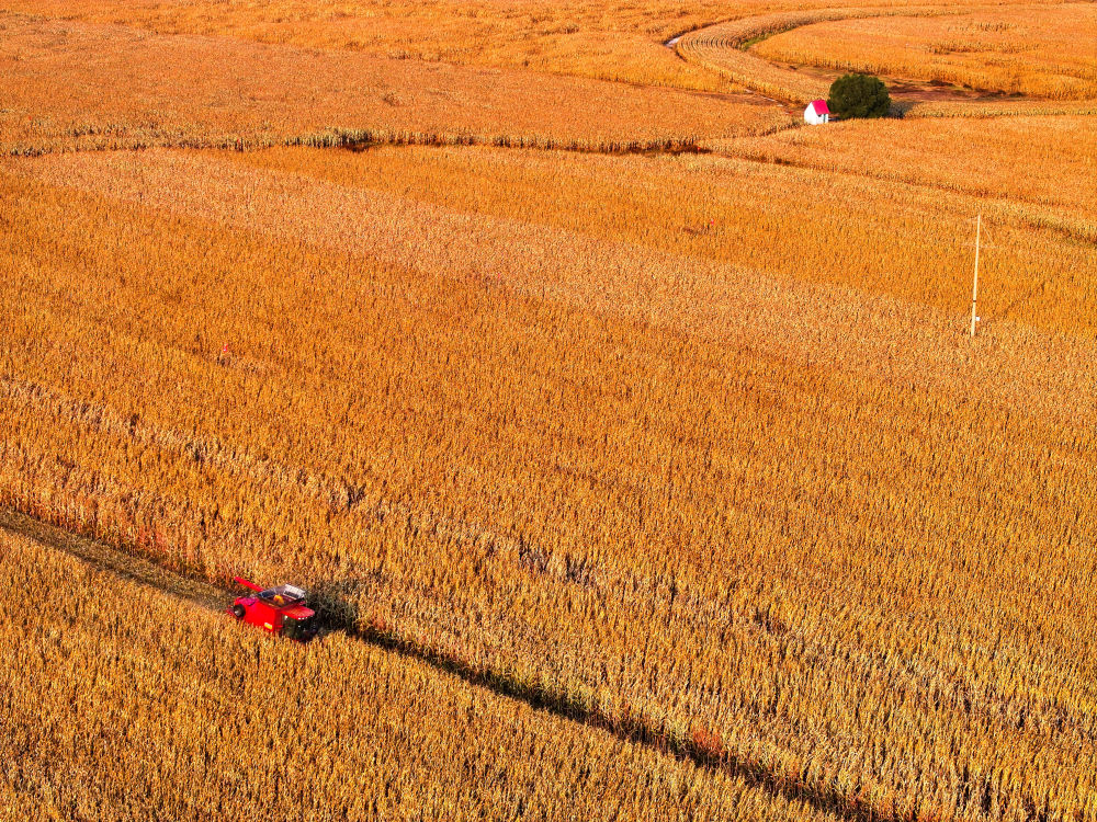 農(nóng)機(jī)手駕駛收割機(jī)在內(nèi)蒙古自治區(qū)通遼市科爾沁區(qū)豐田鎮(zhèn)收割玉米(2025年10月14日攝,無人機(jī)照片)!笆奈濉睍r(shí)期,糧食總產(chǎn)量由2021年的1.37萬億斤增至2025年的1.43萬億斤,連續(xù)兩年站穩(wěn)在1.4萬億斤的臺(tái)階。