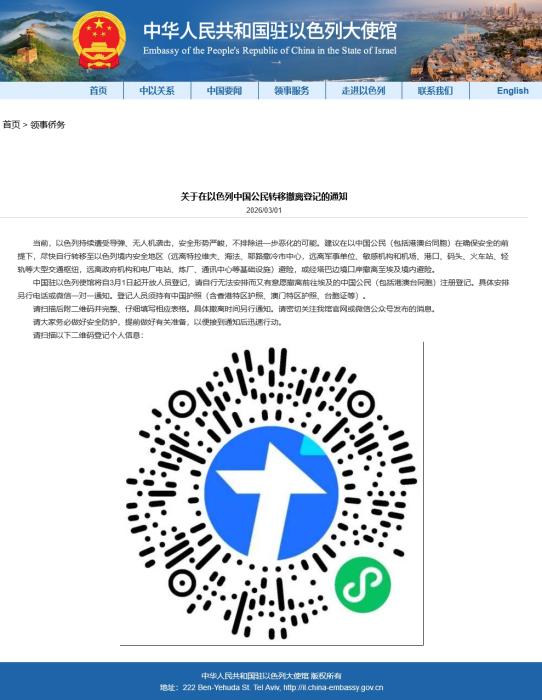 中國駐以色列使館3月1日發(fā)布通知稱,建議在以的中國公民(包括港澳臺同胞)在確保安全前提下,盡快轉(zhuǎn)移至以色列境內(nèi)安全地區(qū)避險。使館自3月1日起開放撤離登記,無法自行安排但有意前往埃及的中國公民(含港澳臺同胞)可注冊登記,需持有效中國護照或港澳臺相關(guān)證件(臺胞證、港澳特區(qū)護照等)。