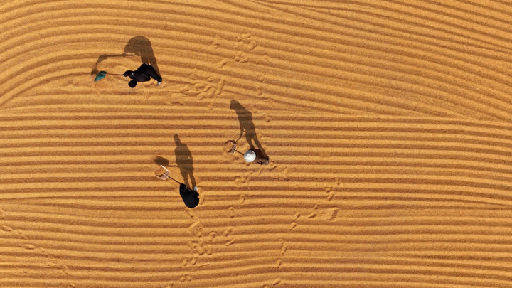 2025年10月28日,在山東省棗莊市市中區(qū)稅郭鎮(zhèn),農(nóng)民晾曬收獲的玉米(無人機照片)。 新華社發(fā)(孫中喆 攝)