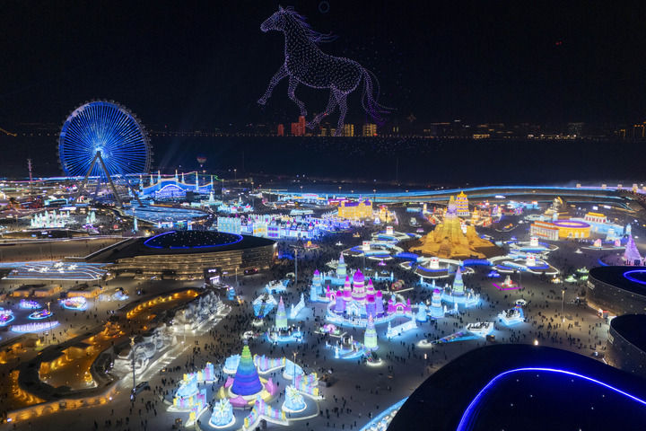 這是2026年1月5日拍攝的哈爾濱冰雪大世界園區(qū)的無人機表演(無人機照片)。 新華社記者 張濤 攝