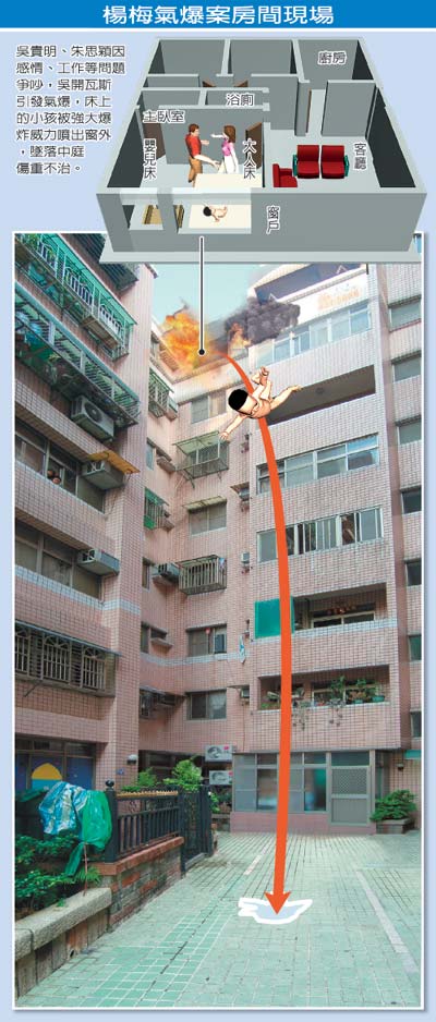 小區(qū)居民被氣爆嚇得魂不附體,跑到中庭查看,發(fā)現(xiàn)八樓住戶的窗戶炸出一個大洞,冒出濃煙;兩歲男童朱馨玉被強大氣爆炸飛出窗外,摔落地面,已奄奄一息。