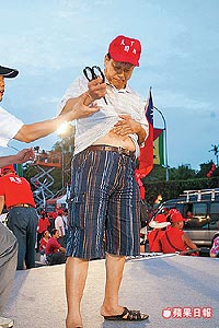 去年焚車嗆扁的蔡芳樹,昨天剪刀刺肚皮,抗議陳水扁害人民生活困苦。(圖:臺灣《蘋果日報(bào)》)