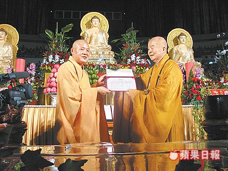 佛光山創(chuàng)辦人星云法師(右)致贈(zèng)感謝狀給寒山寺住持秋爽法師。