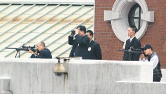“雙十”活動現(xiàn)場,臺當(dāng)局安全單位高度警戒,陳水扁辦公樓上方及其他制高點(diǎn),配置十幾名狙擊手。圖中理平頭者系平日緊跟陳水扁的貼身隨扈。臺灣《聯(lián)合報》記者胡圣堤攝