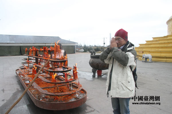 臺(tái)灣《聯(lián)合報(bào)》記者在華藏寺大殿前拜祭許愿(攝影:陳寧)
