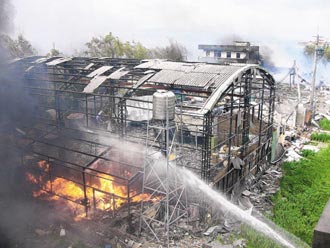 苗栗縣后龍鎮(zhèn)地下爆竹工廠爆炸,以鋼架及鐵皮搭建的廠房被夷為平地,消防人員以水柱撲滅余火!堵(lián)合報(bào)》記者羅緗綸攝