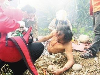 一名傷者滿臉鮮血,赤裸著上身,在現(xiàn)場(chǎng)哀嚎,救難人員正準(zhǔn)備將他抬上擔(dān)架送醫(yī)!堵(lián)合報(bào)》記者段鴻裕攝
