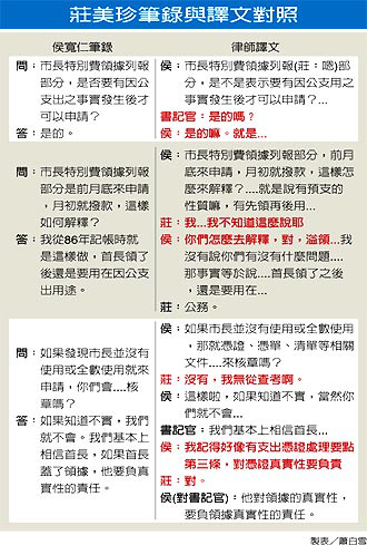 馬案律師團(tuán)10月26日遞狀,聲請(qǐng)勘驗(yàn)臺(tái)北市政府秘書處會(huì)計(jì)人員莊美珍在今年1月25日接受檢察官侯寬仁偵訊錄音帶,提出完整譯文,指檢方筆錄將對(duì)馬英九有利部分略而未記。