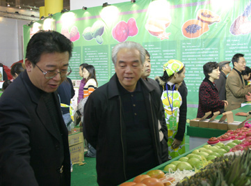 “中國湖南第七屆農博會”上,湖南省臺辦佘友文主任(左二)到臺灣水果展區(qū)參觀。(資料圖)