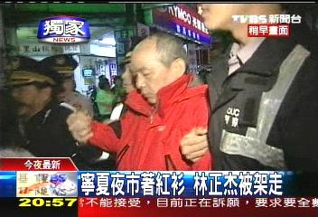 嗆扁也在臺北發(fā)生!陳水扁23日晚間到臺北寧夏夜市吃蚵仔面線,“紅衫軍自主公民協(xié)會”會長林正杰和幾位“紅衫軍”成員在街口透過廣播高喊“阿扁下臺”,警方趕緊前往處理,并將林正杰帶離現(xiàn)場。