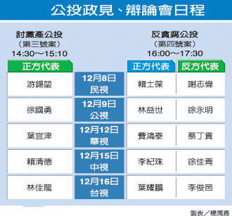 由于“討黨產(chǎn)案”沒有人提出反對意見,因此只有提案的正方單方論述;“反貪腐公投案”則因綠營提出反對看法,有正、反方的辯論。(高大林)