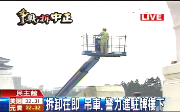 據(jù)臺灣“中央社”、TVBS電視臺報道,臺當局“教育部”昨天動工拆換“中正紀念堂”牌匾,今天上午展開“大中至正”牌匾拆除準備,吊車進入園區(qū),“大中至正”牌樓前也架設(shè)腳手架,豎立圍籬,工程人員進駐準備施工。
