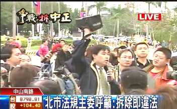 不過因為臺北市政府一再強調(diào),臺當局“教育部”這樣的動作是“違法行為”,臺北市法規(guī)會主委葉慶元和勞工局長蘇盈貴,親自到現(xiàn)場用擴音器對拒馬里的保警喊話,要求保警立即執(zhí)行公權(quán)力,阻止拆卸的作業(yè),否則也將對保警采取“法律行動”。