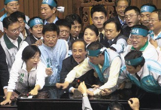 民進(jìn)黨癱瘓議事的招術(shù)還不只一招,上次用強(qiáng)力膠及大鎖鎖住議事主席進(jìn)出的大門,這次改用議事人員的座椅全面堵住大門,不讓王金平進(jìn)出。據(jù)透露,民進(jìn)黨備妥“和平”與“暴力”兩種因應(yīng)版本,只要國民黨要玩“硬的”,絕對奉陪到底。