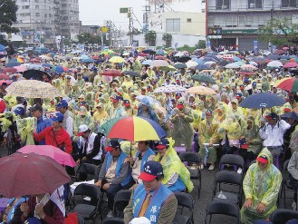 支持民眾不畏大雨,參加臺東縣馬蕭競選總部成立大會,情緒高昂。(聯(lián)合報圖)