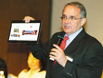 臺灣美國商會執(zhí)行長魏理庭希望未來臺灣地區(qū)能出現(xiàn)不只會操弄民意的領導人,圖為5月底他以進口巧克力,說明臺當局兩岸政策的荒謬!堵(lián)合報》資料照片