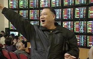 馬英九特別費案二審獲判無罪,臺股一度瞬間急拉百余點,一名投資人高興的舉臂歡呼。(東森新聞圖)