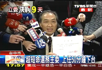 中國(guó)臺(tái)灣網(wǎng)1月4日消息 據(jù)臺(tái)灣TVBS報(bào)道,臺(tái)中市選舉委員會(huì)新任代理主委薛秋發(fā)因涉及賭博案遭起訴,昨天下午開會(huì)請(qǐng)辭。薛秋發(fā)從上任到辭職僅50分鐘,創(chuàng)選委會(huì)主委任職時(shí)間最短記錄。臺(tái)當(dāng)局“行政院”昨晚召開會(huì)議,指派無(wú)黨籍人士、原臺(tái)中市選委會(huì)委員蔡壽男接任臺(tái)中市選委會(huì)主委一職。